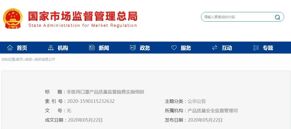 国家市场监督管理总局发布《非医用口罩产品质量监督抽查实施细则》